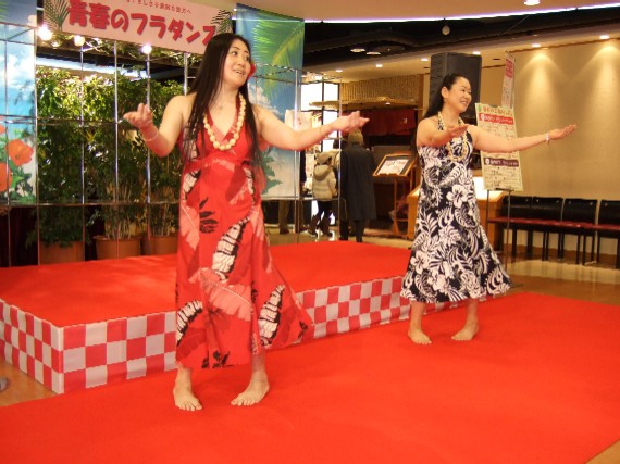 昨日の記事でも告知されていた通り、本日ラフィラにて 「新春のフラダンス」というイベントが開催されました。 私もカメラマンとしておじゃましたところ、 Sayuri店長に「ブログ書いてね」と頼まれてしまいましたので(笑) レポートさせていただきます! ラフィラではお正月と初夏の年二回、フライベントが開催されています。 ピカケオハナの参加は昨年の夏に続き2回目ですね。 前回はお店がオープンして間もない頃だったので 宣伝のため、飛び入り参加させてもらったそうですが 評判が良かったのか、なんと今回はラフィラ側から出演のオファーを いただいたそうで、店長はとても感激していました。 また、Sayuri店長とスタッフYuriさんがどんなフラを披露するのか 楽しみにしていたお客様も多かったのでは? 実際、二人がステージに登場した時にはお客様から声援が飛んでいました! 二人はオーシャンズ&イットさんのドレスで登場! いわゆるお揃いの衣装ではありませんが、 同じパターンのドレスで揃えていてこれもまた素敵でした。 (15日まで店頭で取り扱っているそうなので、実物を見たい方はお早めに!) ステージには2回登場し、それぞれの回でプレゼントクイズの出題と フラを2曲づつ披露したのですが 2回目のクイズのくだりから、二人がとあるお客様に 「リリィズ」と命名されていたことが判明。 「さゆり」と「ゆりこ」だから、リリィズ(リリィ=百合の花)ね。なるほど~!! 以後、司会の方も二人のことを「リリィズ」と紹介していました(笑) 皆さんもこの二人がペアで踊っている姿を見たら 「リリィズ~!」と声をかけてあげてくださいね!? それでは、リリィズのパフォーマンスの様子をどうぞ! ちなみに披露した曲は… 12:10~ ①No pueokahi ②Manu 'o'o 14:10~ ①Kaimuki hula ②Ke Aloha でした! <Aiko>