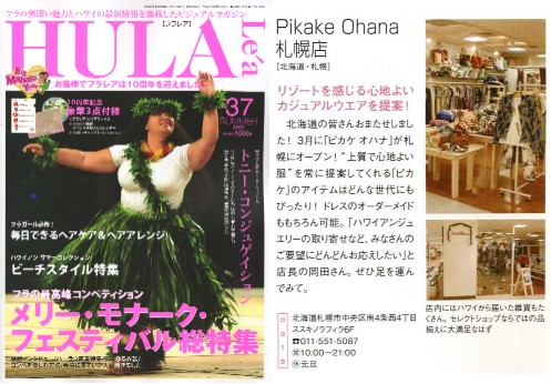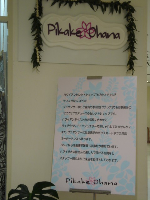 久しぶりに登場のSayuriです 今月は 丸井今井でのハワイアンイベントに参加! 来て下さった方~ありがとうございましたぁ☆ じつはこのイベントに昨年と一昨年に「ピカケ」が参加したところ 北海道での需要を感じ・・・ そこから「ピカケオハナ」のオープンにつながっているんですよ 昨年のこのイベント会場でプロデューサー細波氏と私は劇的に(?)出会ったわけで… あの時の熱い思いが今はラフィラ6階に「ピカケオハナ」として存在しているんですよね そんな思いで過ごした6日間でした☆ 今回のイベントで出会ったお客様の中にも すでにラフィラまで足を運んで下さった方が何人もいて嬉しく思っています また、札幌以外の道内の方にも 「ブログ見てます」と何人もの方に声かけていただき感動しました(^o^) お客様とお話した中で要望が多かったのが ○ブログでもっと商品紹介して欲しい ○代引をやって欲しい などなど 代引は早速手配中ですのでもう少しお待ちくださいね またこれからは新商品紹介をなるべく行っていきますので こちらももう少しお待ちくださいね☆ 最後に2つご紹介です ◎ピカケオハナに新しいパネル看板が登場☆ これはラフィラさんが用意してくれたものです ピカケのショッピングバッグでお馴染の柄をモチーフに ピカケのイメージカラー ピンクでかわいいでしょ お店の正面に飾ってありますのでご来店の際にチェックしてみてください ◎もうひとつ! フラレア37号はすでにお手元にありますか(笑)? 156ページ必見!! 前回号に続き 今回は「CHECK & GO!」にピカケオハナが登場です フラレアからの取材を受けるなんて・・・ これからも頑張ろう! と心に誓う私でした <Sayuri> |