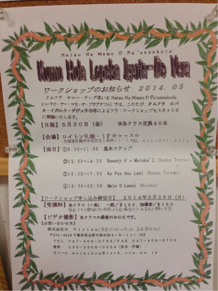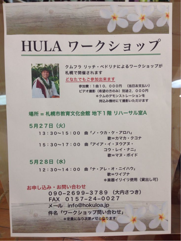 普段なかなかお会いできないお客様と お久しぶりの対面ができて(≧∇≦) 店をやっていて良かった!と実感です^_−☆ そして〜 ブログ効果!ではないけど(笑) みなさん、ちゃんとチェックしてくれているらしく^_^; アップの仕方が偏りすぎとまたまたご注意いただく始末で… ごめんなさい(´・_・`) 気を取り直し〜がんばる!! いつまで続くかな〜(笑) GW中にもハワイアンイベントがあり みなさん、少しづつ忙しくなってきているような〜 フライベント参加となると 今習っている曲とは別に、 発表する曲の踊り込みなどもあり、 ただ踊るだけではなく、 立ち位置や入退場の仕方、フォーメーションなんかもあったりして、 じつは頭がパツパツになりますよね(≧∇≦) それも嬉しい悲鳴だったりしますが(笑)! そんなみなさんに〜 さらに頭パツパツにしてみるご提案☆☆ クムフラからの直接フラを習えるチャンス♪ ワークショップが続いて開催になります それぞれの個性もありますし〜 選曲にもよりますし〜 あとは 今習っている先生の許可が必要かとは思いますが 違うハラウのフラダンサーと一緒に一つの曲を習うのも これまた勉強にも刺激にもなります 興味のある方は参加してみませんか?^_−☆ Yuriさんと私と… どこかでお会いしたら〜 声かけてください(笑) 〈Sayuri〉 |