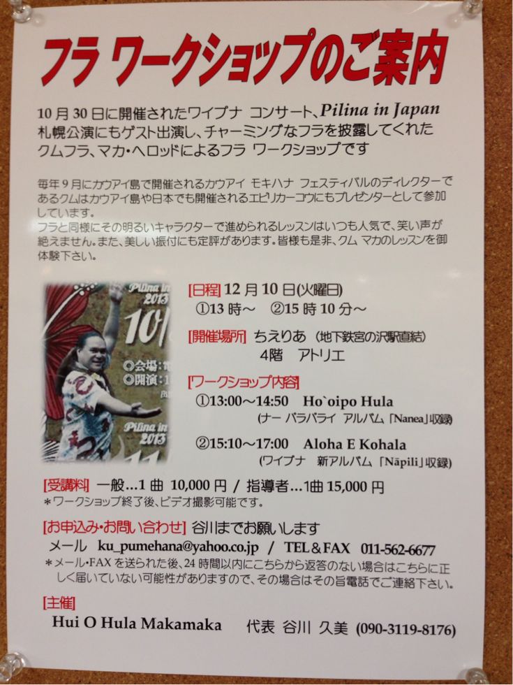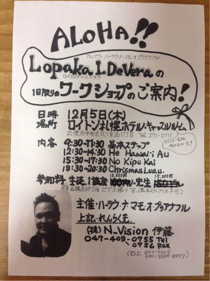 とうとう雪も積もり… このまま根雪かな〜(^^;; こんな時期にハワイからクムが来日^_−☆ 札幌でワークショップが2つも開催されますよ〜*\(^o^)/* まずは12月5日、木曜日、 クムフラ ロパカ・イガルタ・デヴェラ によるワークショップです サニー・チンのハラウと言った方がわかるかも(笑)? もう一つは12月10日、火曜日、 クムフラ マカ・へロッド によるワークショップです クム マカ のワークは とても楽しいらしいですよ〜^_−☆ それぞれ 日程や曲をチェックして せっかくの機会ですから 直接ハワイのクムからレッスン受けてみるのはいかがですか?^_−☆ まずは 自分の直接の先生に確認してみてくださいね ちなみに… 私は今回は事情あり(笑)行けなくて残念…(^^;; Yuriさんは一つ申し込みしてます^_^ 会場で見付けた方は お声掛けくださいね^_−☆ 〈Sayuri〉 PR |