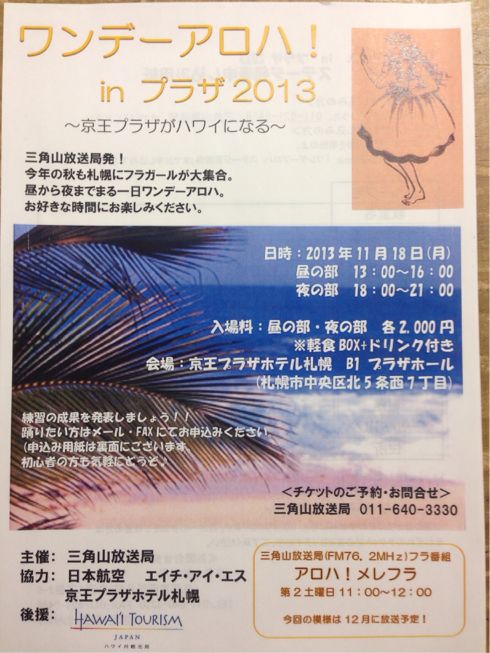 ありがとうございました^_−☆ 大盛況!! 楽しい時間を共有できて幸せ(笑) 今回は ピカケオハナの出店に加え 欲張りにも昼の部のステージにもエントリーしていて 私が一番楽しんでしまったかも(笑)です 会場には フラを愛する方たちの思いで 温か〜い空気が流れていましたよね〜*\(^o^)/* お店はこんな感じ! 今回は広々〜^_−☆ この感じのまま 今週末は苫小牧!!へ 苫小牧駅前にある『えがお』さんで 今年もフライベントが開催されます*\(^o^)/* イベントでいつもご一緒させていただく出店者の方たちと6店舗展開(*^^*) 地元苫小牧で活動されているフラダンサーや、 札幌から参加のダンサーもいて フラショーは両日11時〜あります 23日、土曜、午後からは Yuri ちゃんと2人で4曲、踊らせていただく予定^_−☆ 今回も店とステージと参加します(笑) お近くの方、 週末のスケジュールがまだ決まっていない方、 是非、遊びに&応援に来てくださ〜い*\(^o^)/* 会場でお待ちしてま〜す 〈Sayuri〉 PR