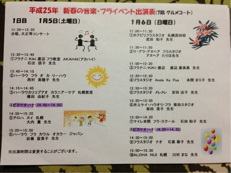 ススキノラフィラ7階で行われる 『新春の音楽・フライベント』 例年では 2日初売り、3日4日がイベントでしたが 今年は初めて土日に変更 5日明日は、 11:20〜 合唱と大正琴コンサートからのスタート 13:30〜 6チームのフラが、15:50まで続きますよ(^_−)−☆ これまた恒例の 『ピカケオハナ』もお店紹介の時間をいただき 4番手、14:45〜5分間、1曲参加させていただきます(*^^*) 6日明後日は、11:00〜 スタート! この日は、10チームが、15:30まで、 フラステージが続きます(笑) この日も 8番手、14:20〜10分間、2曲参加させていただきます(≧∇≦) もちろん無料で楽しめるステージです お時間ある方は是非応援にいらしてくださいね(≧∇≦) 〈Sayuri〉 |