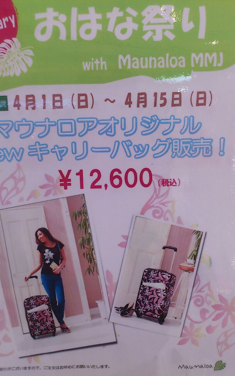 『おはな祭り』第2弾スタートです(*^^*) 第1弾で足を運んでいただいた皆さん ありがとうございました(^-^) 折り返し~ まだまだ『おはな祭り』は続きま~す! 【第2弾】の目玉商品は ↓ ☆マウナロアMMJタイアップ企画 キャリーバッグの受注販売会です ガーデンティアレ柄ブラックのみ 本体価格12000円 サイズは H55×W35×D20センチ 内側に2つ、外側に3つポケットあり 5日までにご注文いただいた方は期間中にお渡し可能 6日以降ご注文の方は順次ご連絡にてお渡しになります これを機会にキャリーバッグ欲しいな~と思う方は 是非是非一度見に来店してみてくださいね♪ 他にも ☆パラダイスの新作バッグとポーチ ☆ナニプアからは人気のチュニックなど 店内は 「てんこ盛り」状態です(*^^*) もちろん 明日からの第2弾も 税込10500円以上お買上の方先着20名様に ノベルティーをご用意しています お待ちしていま~す(^_^)v 〈Sayuri〉