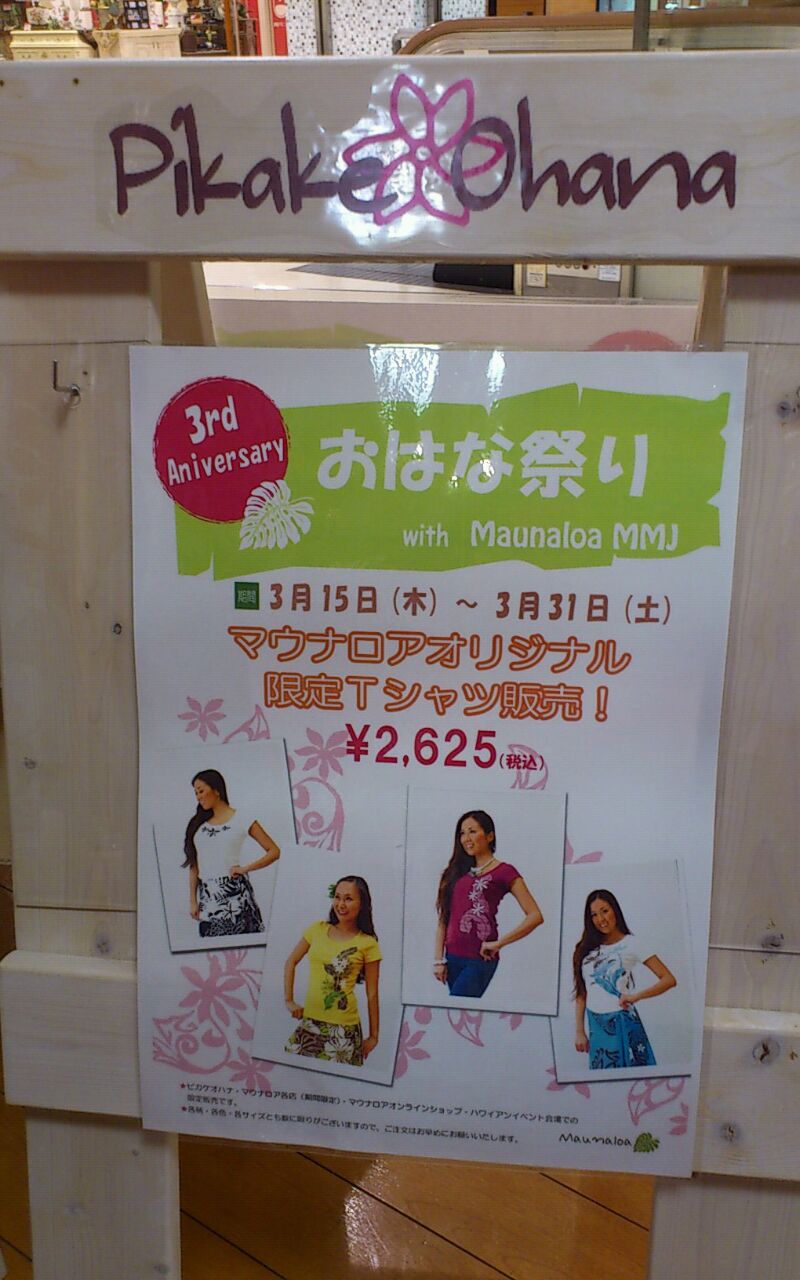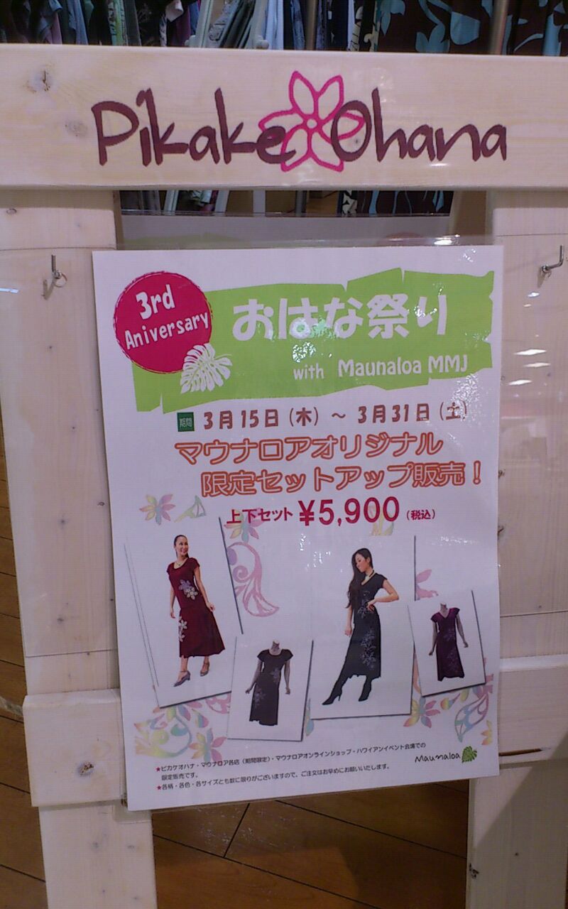 3月15日(木) おかげ様で、3周年を迎えることとなりました(*^^*) いつも『ピカケオハナ』を応援していただいている皆様に感謝の気持ちを込めて 今年も〈おはな祭り〉を開催します! 【第1弾】3月15日(木)~31日(土) ☆マウナロアMMJタイアップ企画 ①カットソーセットアップ ②Tシャツ の同時受注販売会 ☆アカハワイ ヒロクメシリーズ 登場 ☆パラダイスより人気のバッグ5型入荷 【第2弾】4月1日(日)~14日(土) ☆マウナロアMMJタイアップ企画 ③キャリーバッグ受注販売会 ☆ナニプア新作チュニック入荷 ☆ハナリマ新作入荷 など その他オハナブランドからも たくさんの新作が入荷予定です♪ 特典として~ ○マウナロアMMJ受注商品を、税込5250円以上お買上のお客様、先着30名様に マウナロアMMJノベルティプレゼント ○おはな祭り期間中、お買い物合計税込10500円以上お買上のお客様、先着40名様に ピカケオハナノベルティプレゼント させていただきます(笑) ワクワクする店内が出来上がりましたよ~(^^)v ぜひお時間作って お立ち寄りくださいね♪ お待ちしております 〈Sayuri〉 |