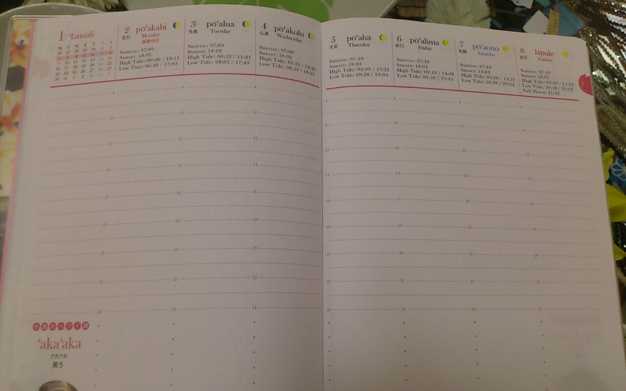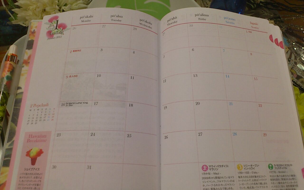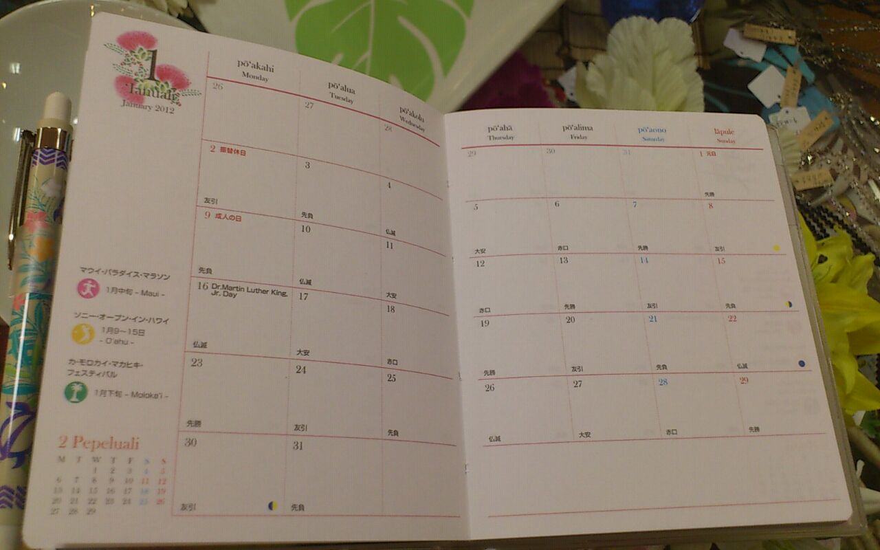 この時期になると要望の多かった 『2012年用スケジュール帳』! 去年も一昨年も 「ごめんなさい」していましたが 今年はどうどうとご紹介できます(鼻息) それも『マウナロアMMJ』のもの♪ マウナロアでは 毎年人気であっという間に売り切れてしまうらしく 増産を何回か行いながら対応しているとのこと だからきっとピカケオハナでの展開は諦めつつも… ダメもとで確認したら→展開ok☆ で、入荷となりました(笑) サイズは2つ それぞれ2柄あり 4パターンの中から選べますよ(*^^*) B5サイズは 月間、週間、時間別管理が可能 ボールペン付で本体価格1700円 ミニサイズは 月間管理のみですがコンパクトで便利 同じくボールペン付で本体価格1400円 数に限りがありますので スケジュール帳 気になる方はご連絡くださいね(^-^)v 今回は… 画像の順番 大丈夫かな~…心配… 〈Sayuri〉