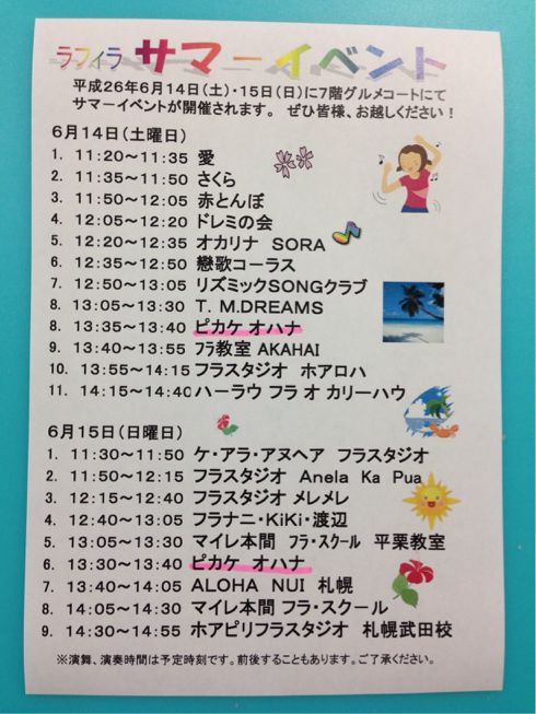 年2回、年明け早々と、6月のこの時期(*^^*) ラフィラには文化教室が充実していて 皆さん積極的に活動されています^_−☆ その中でもフラ人気はすごい!! 今は、フラだけでも、 15人の先生が、22コマのお教室を開いているんですよ〜 そんな成果を発揮する場! 今回はこのラインナップです(*^^*) 1日会場で見てくださる方 お目当てのチーム目掛けてくる方 など毎回200人くらいの方で会場は賑わいます(笑) 先週はYOSAKOIがありましたが^_−☆ 今週末はフラを楽しんでみませんか? 土曜は フラ以外にもコーラスやオカリナなどあり! そして〜 今回もピカケ オハナ の枠もいただきましたよ(≧∇≦) なんと 両日踊らせていただくことになりました 今回は気合を入れて?新曲を2曲*\(^o^)/*予定です 以前ご紹介していたクムフラによるワークショップから2曲 今回はそれを踊らせていただきま〜す(*^^*) 1曲は 先月ハワイにて受けたクム ナラニ ケアレ の曲 ♪ He Mele Aloha No Puna もう1曲は Yuriさんと私たち所属のスタジオメンバーと一緒に受けたクム リッチ ペドリナ の曲 ♪ He Lei Makana なかなか一緒に練習できていず不安もありますが(笑) そこは皆さんのパワーをいただければと他力本願な部分もあり^_−☆ お時間ある方は応援に来てくださいね*\(^o^)/* p.s. Yuriさんが受けたクム ロパカ イガルタ デヴェラ の曲は いつ披露できるかな〜(笑) 〈Sayuri〉 |