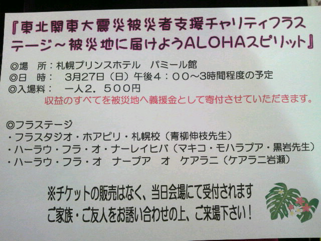 早いような長いような複雑な心境です 札幌ではテレビ等から流れる状況に比べ ハード面的には自分たちの生活にはほとんど支障を感じない毎日… でも ソフト面的には心を痛めたりすでに支援活動をしている方などさまざまですよね なにが正しい情報なのか見極めるのも 私たちにできることの一つだと感じています そんな中 今月15日(火) 『ピカケオハナ』は無事2周年を迎えました 被災地のことを考えると…と皆さんお話しながら それでもたくさんの方がお祝いにかけつけてくれました ご来店いただいた全ての方本当にありがとうございました そして 少しでも皆さんにとってALOHAな気持ちをお届けできる場所でありたいと思いながら毎日お店に立っています 私で話し相手になれるなら… 近くまでいらした方は ぜひ会いにきてくださいね 先週木曜日 ケアラニ岩瀬先生からお電話をいただきました 今回の被災者の方へと フラステージによるチャリティーを行うことにしたとのお話でした 『HULA』を通じて岩瀬先生とも出会うことができ 今回のお誘いもありがたいと思いました 私1人ではできないこと 『ピカケオハナ』だけではできないこと なので 出店させていただき 少しでもお手伝いできたらと思っています チケット等もなく、直接会場へ行き、受付で入場料を払うことで →募金につながります 今こそ? アロハなネットワークで 来週日曜日 会場に集まりませんか? 会場にいらした方は お声かけてくださいね 【東日本大震災被災者支援チャリティー・フラ・ステージ】 〔日時〕 3月27日(日) 15:30開場 16:00スタート 〔会場〕 札幌プリンスホテル・国際館パミール3階 〔入場料〕 2500円 〔ステージ出演〕 ○ハーラウ・フラ・オ・ナー・プア・オ・ケアラニ ○フラスタジオ・ホアピリ ○ハーラウ・フラ・オ・ナーレイヒバ 不明点ありましたら お問い合わせください 〈Sayuri〉